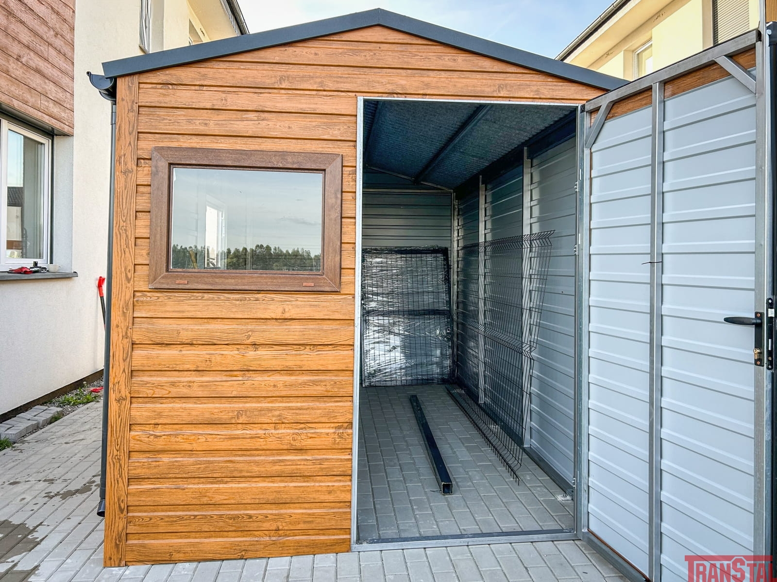 - Zewnętrzne poszycie schowka obłożone jest blachą trapezową ocynkowaną ogniowo w I gatunku w wybranym kolorze i podwyższonej odporności na warunki atmosferyczne.