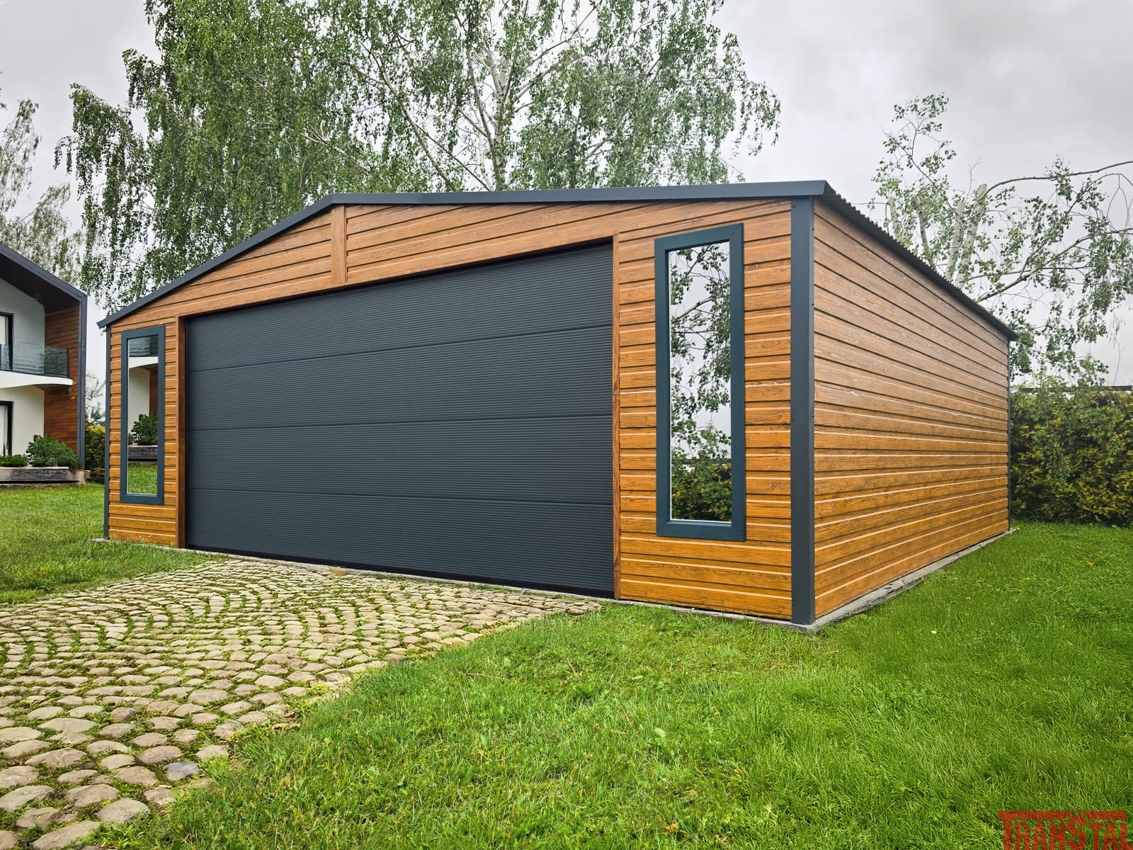 Przedstawiamy kwintesencję nowoczesności i elegancji – nasz garaż blaszany w wykończeniu drewnopodobnym, z bramą segmentową w kolorze antracyt oraz funkcjonalnymi oknami! To rozwiązanie, które zrywa z tradycyjnym postrzeganiem garażu blaszanego jako szarego, funkcjonalnego dodatku, wynosząc go na poziom estetycznego elementu architektury ogrodowej.