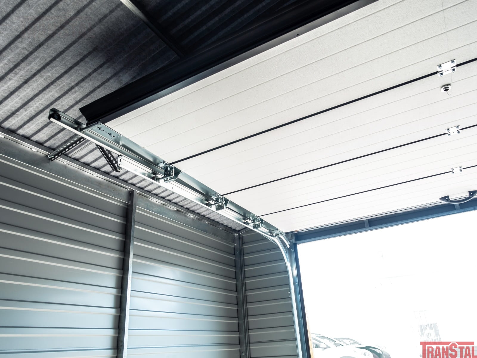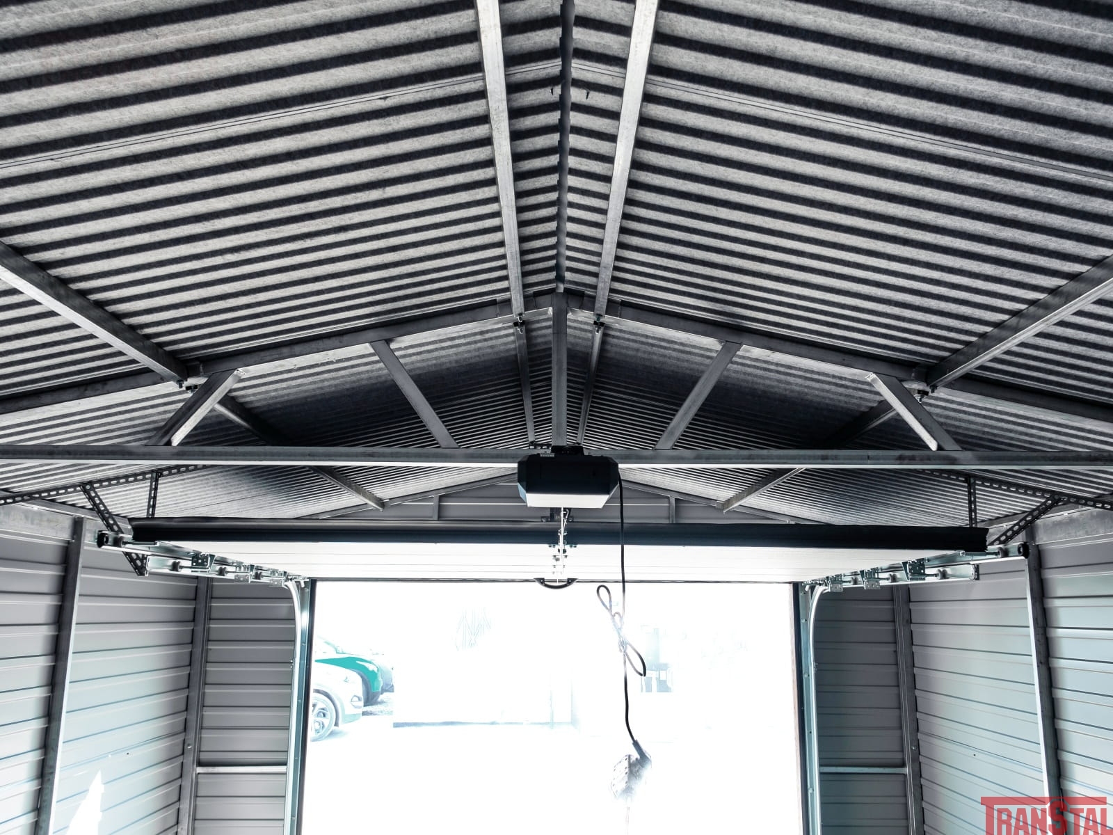 Garaż blaszany o wymiarach 4x6m z bramą segmentową, wyposażony w automatykę oraz rynny.