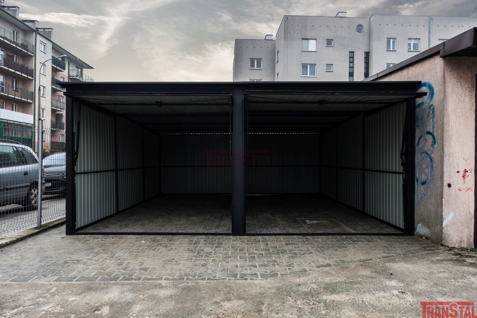 - Zewnętrzne poszycie garażu obłożone jest blachą trapezową ocynkowaną I gatunku i wybranym kolorze.