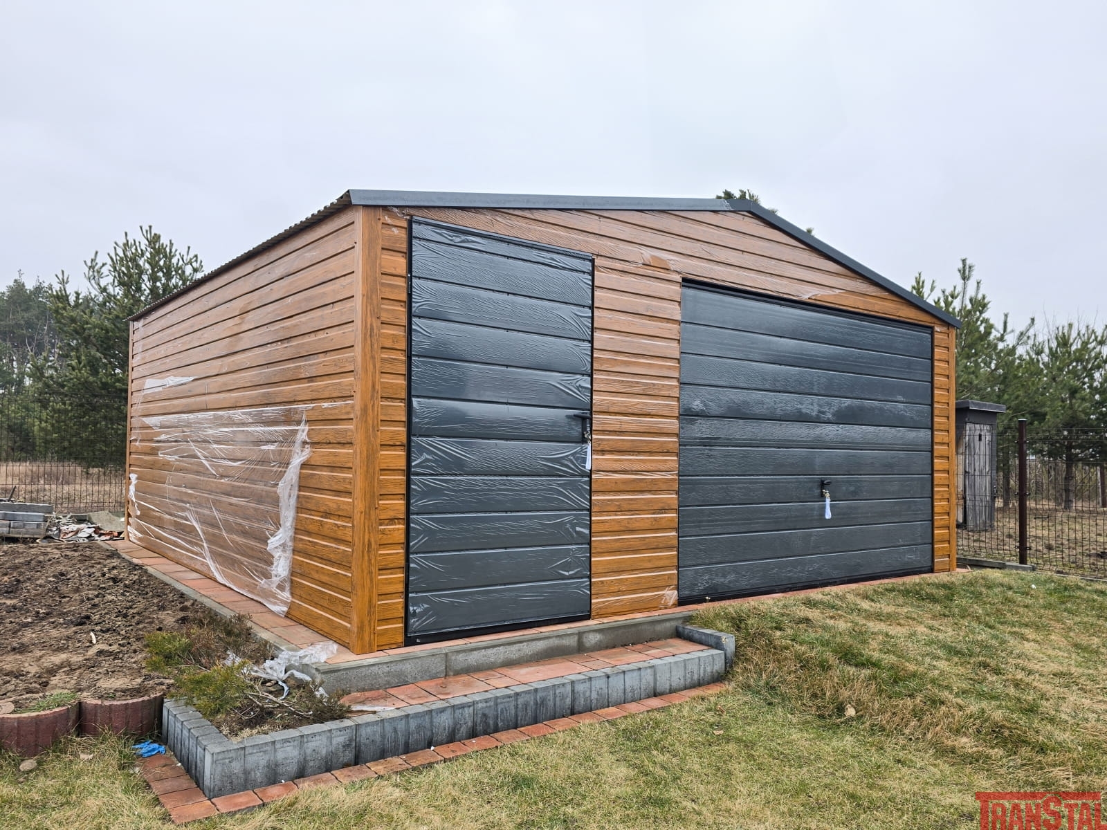 Garaż blaszany drewnopodobny o wymiarach 5x5m z furtką i bramą uchylną.