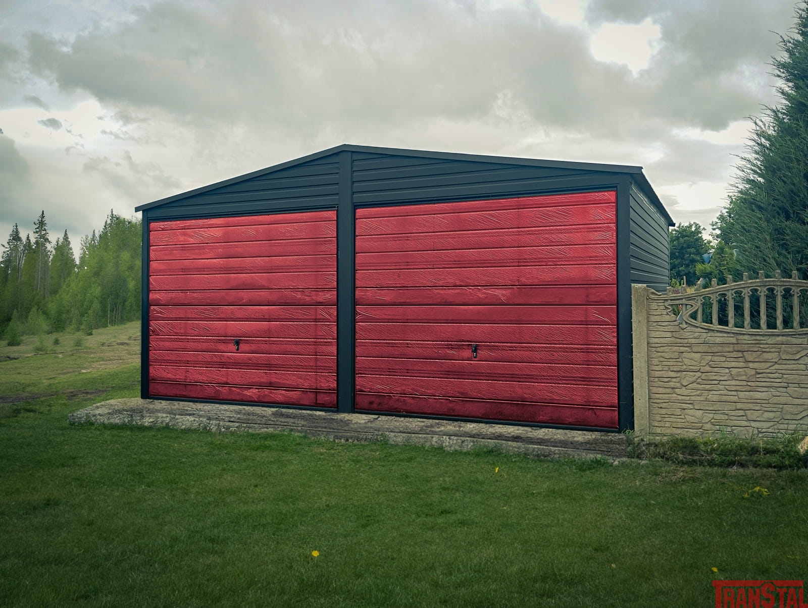 Garaż blaszany 6x6m dwuspadowy Matowa Czerń + Czerwień