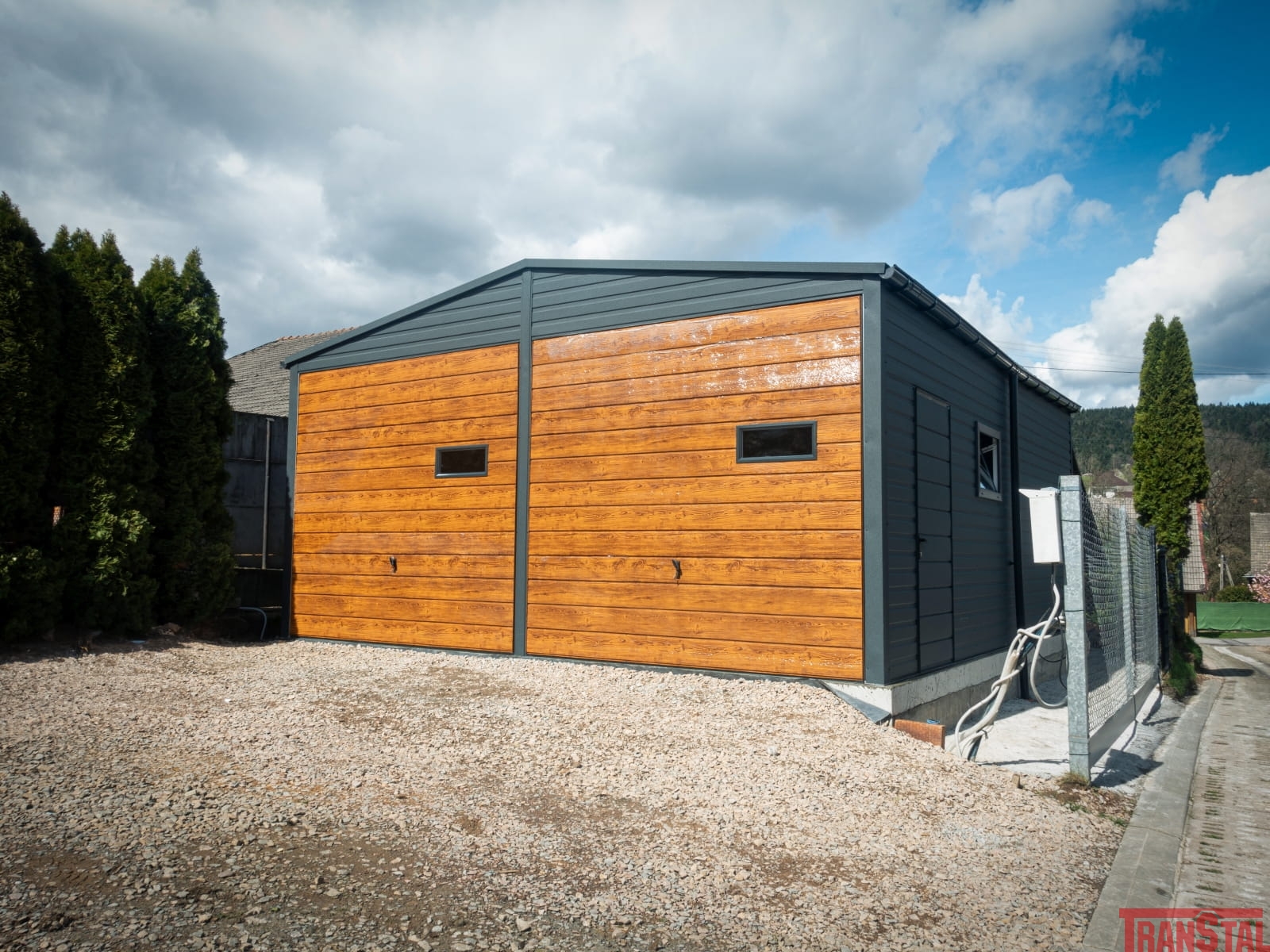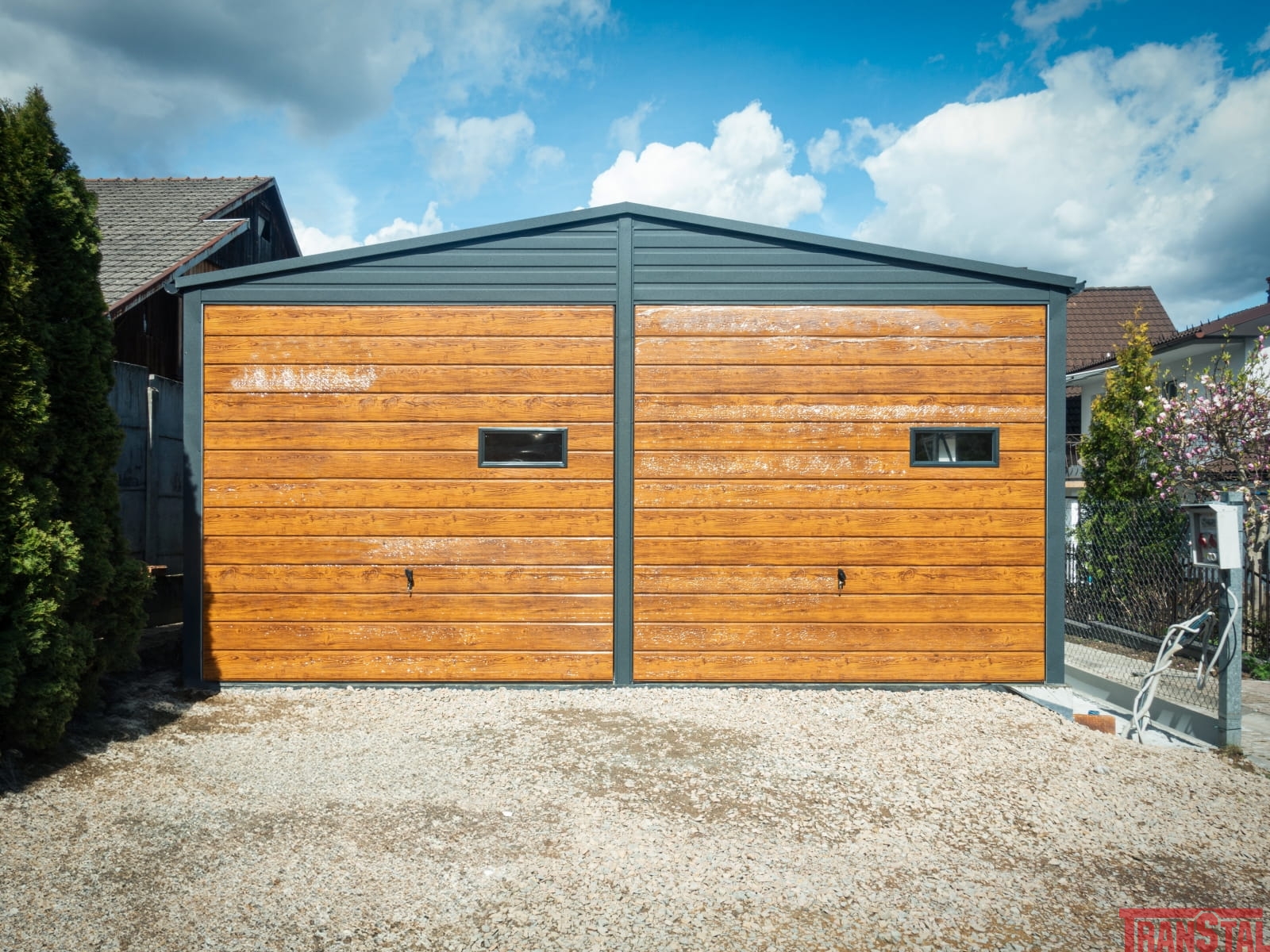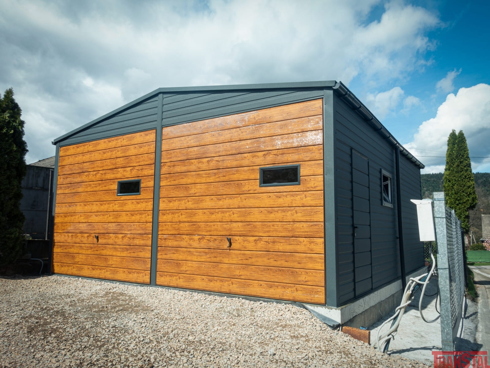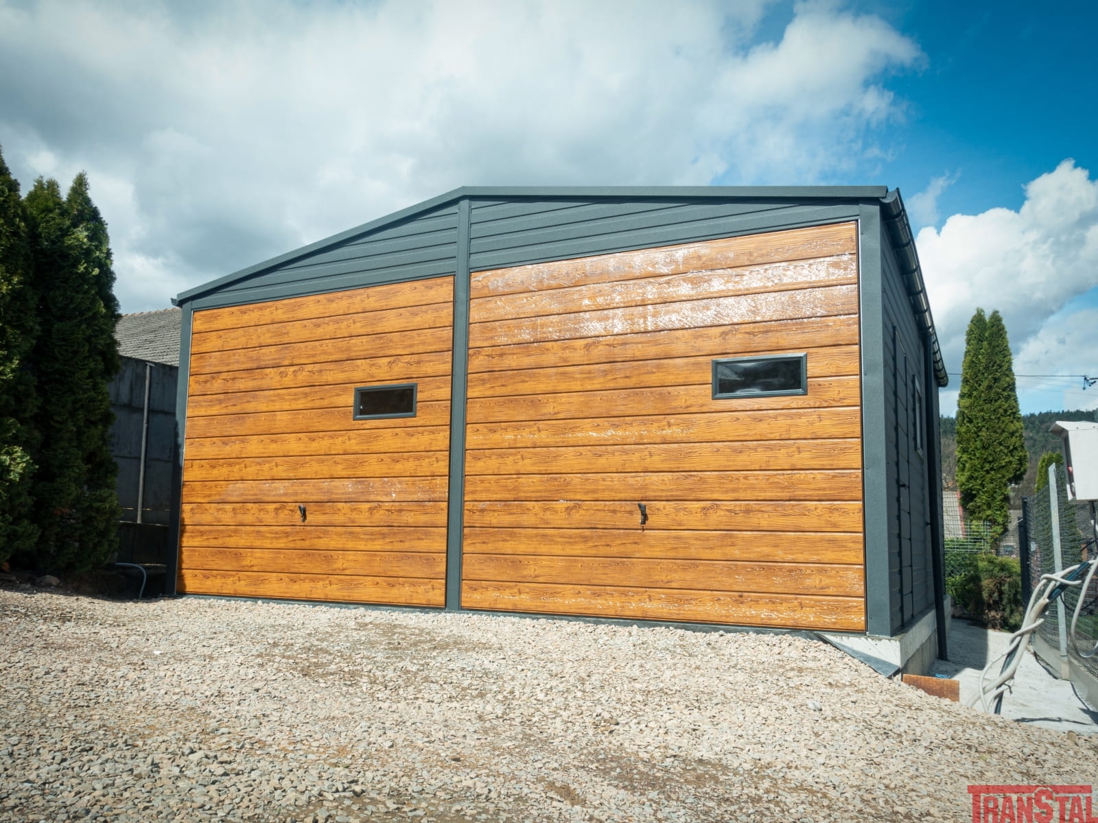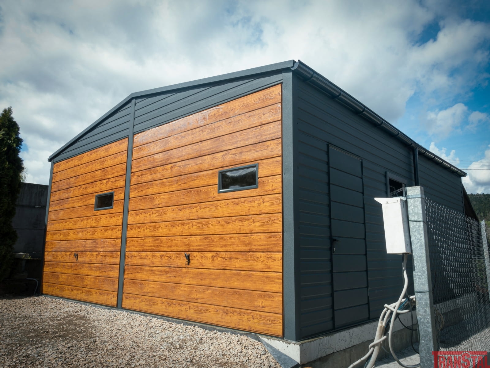 - Zewnętrzne poszycie garażu obłożone jest blachą trapezową ocynkowaną ogniowo w I gatunku w wybranym kolorze i podwyższonej odporności na warunki atmosferyczne.
