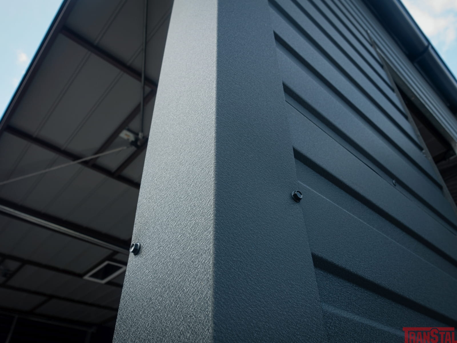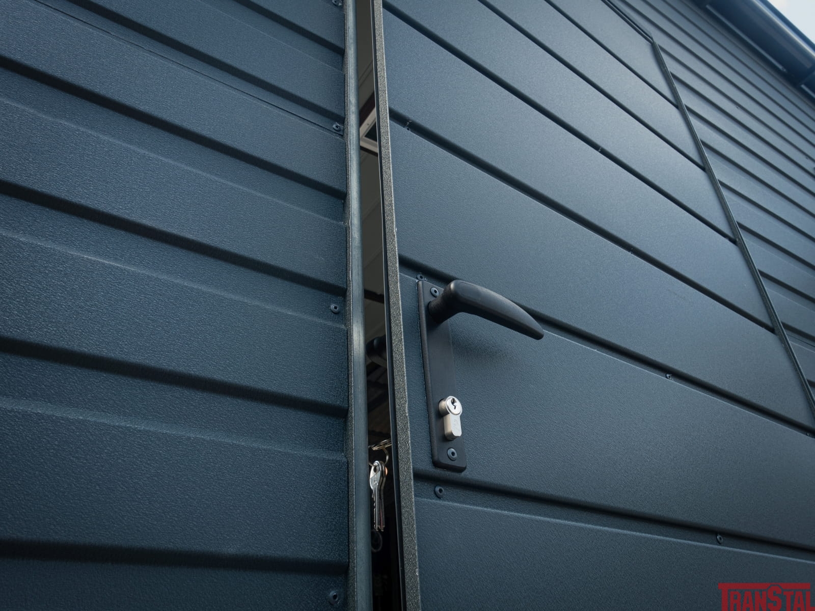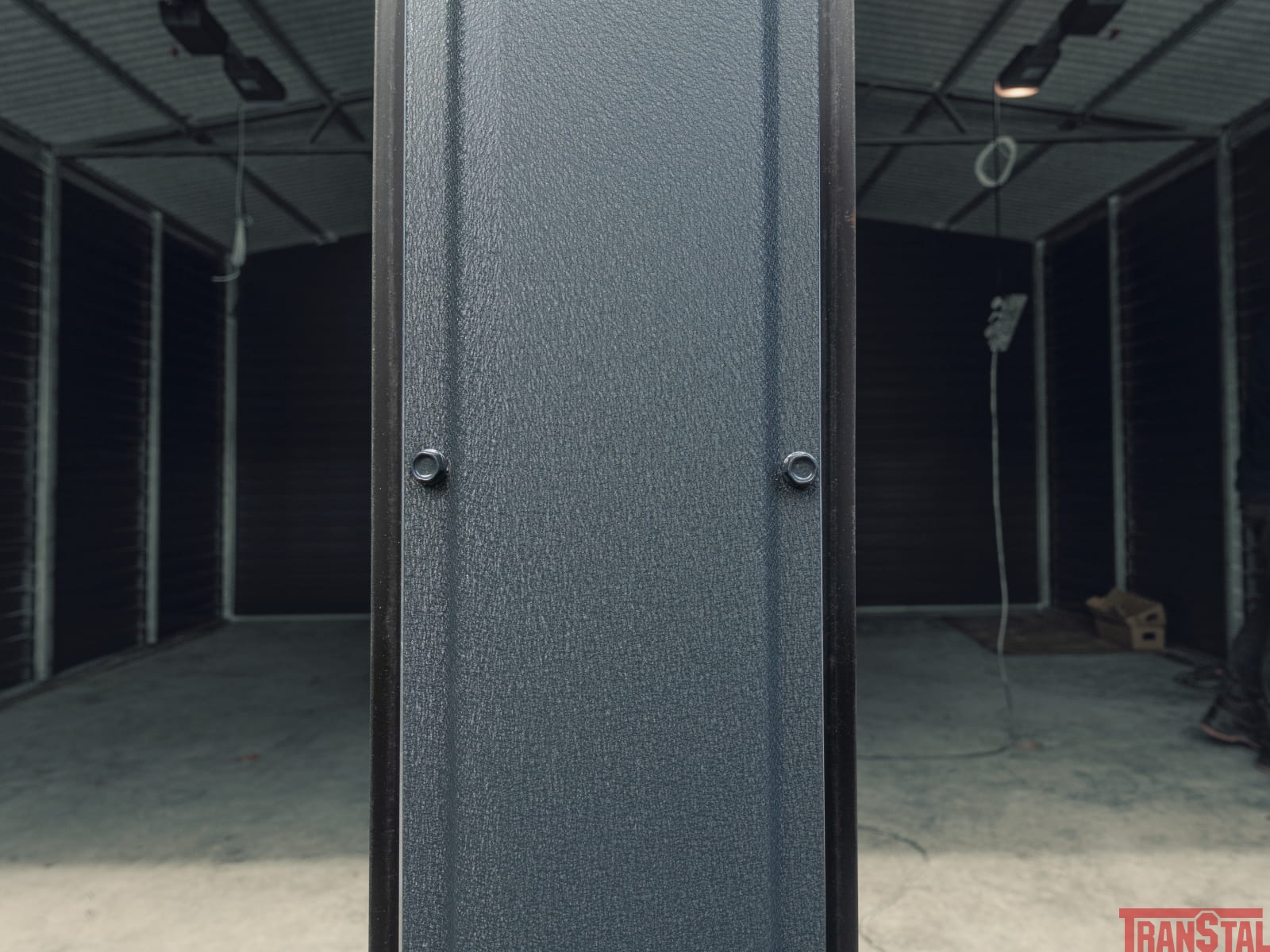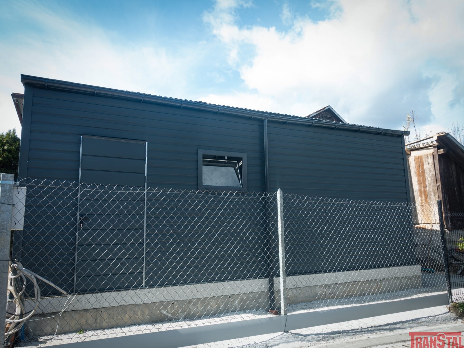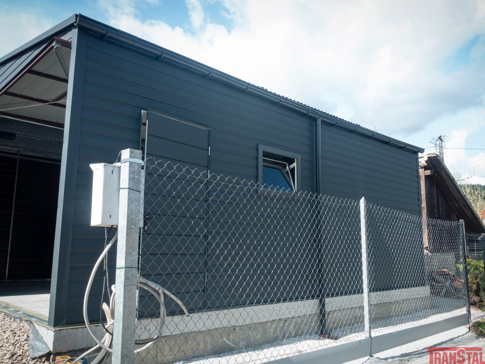 - Zewnętrzne poszycie garażu obłożone jest blachą trapezową ocynkowaną ogniowo w I gatunku w wybranym kolorze i podwyższonej odporności na warunki atmosferyczne.