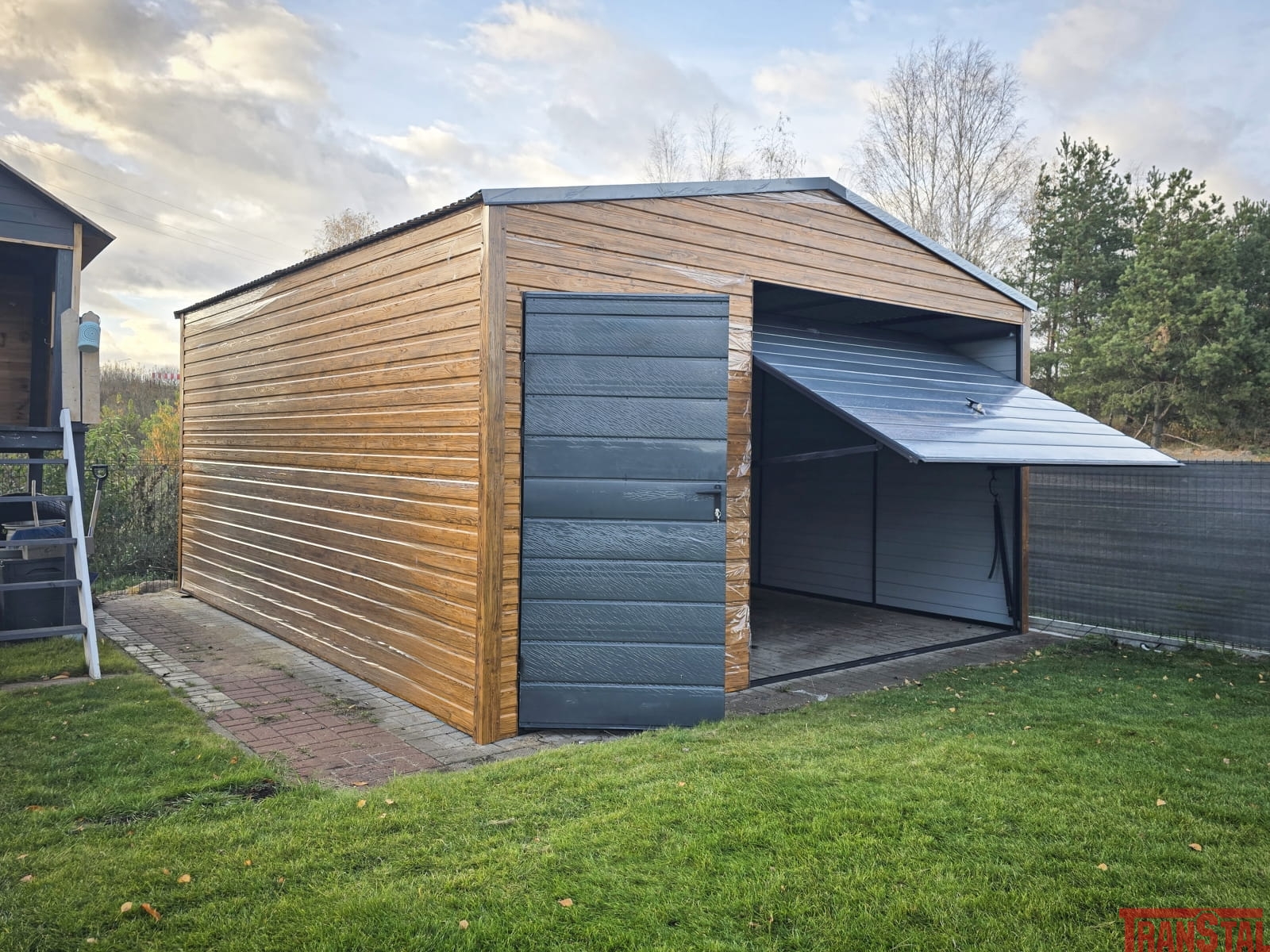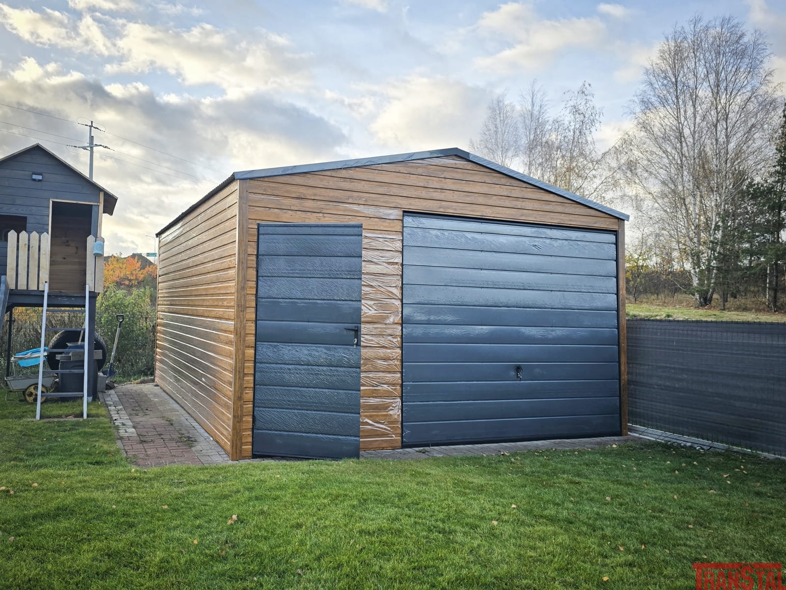 Garaż blaszany drewnopodobny o wymiarach 4,5x5,5m wyposażony w furtkę