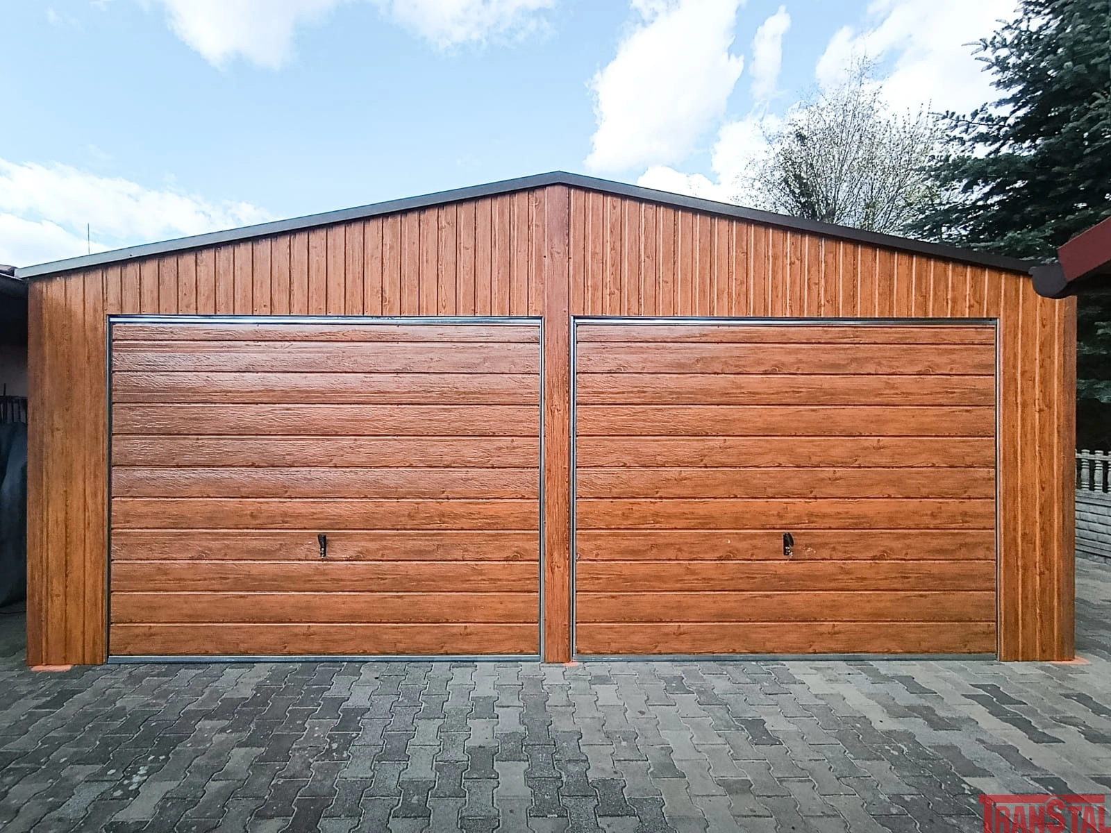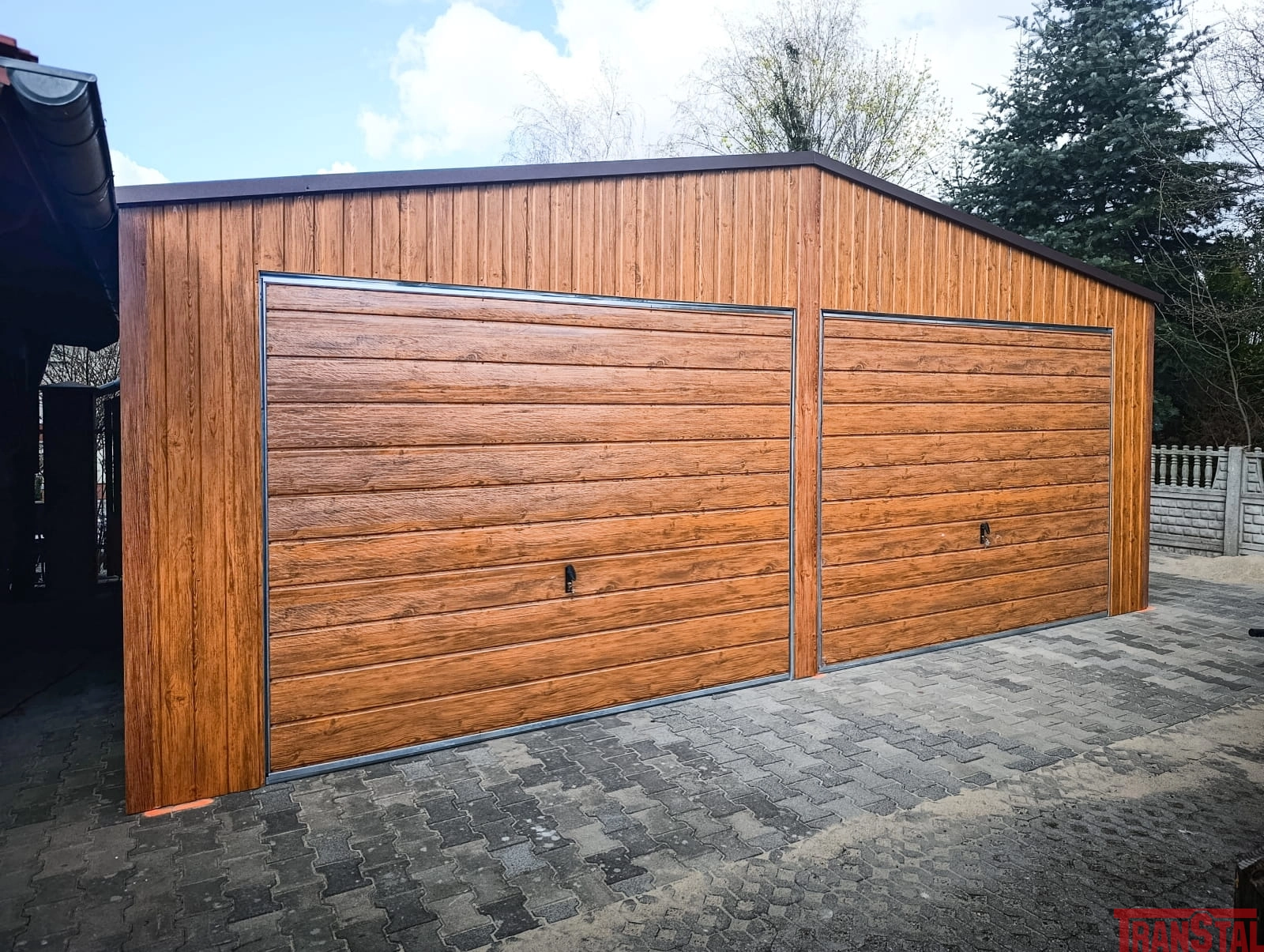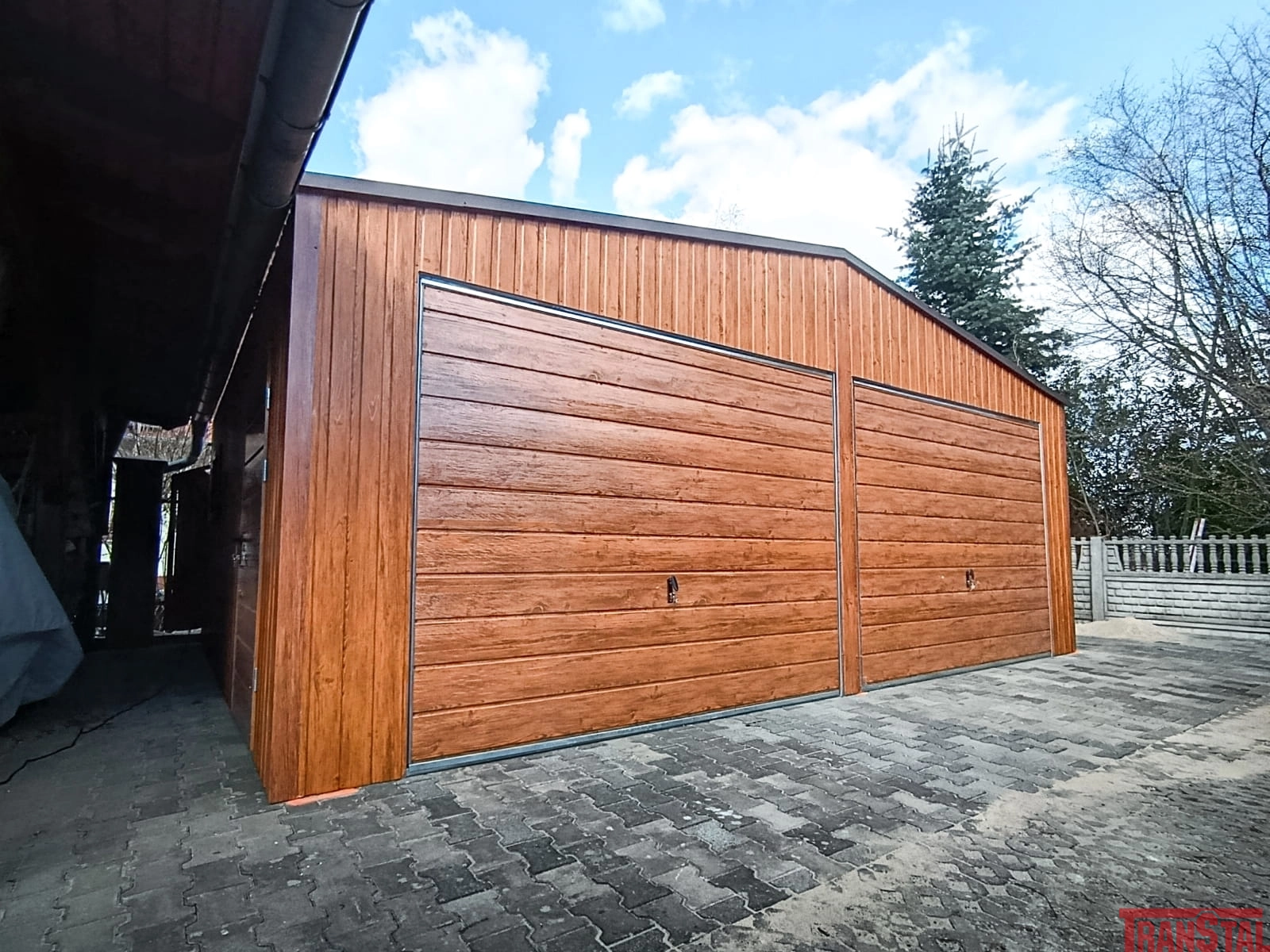 Garaż blaszany drewnopodobny w kolorze Dąb rustykalny wyposażony a automatykę bram.