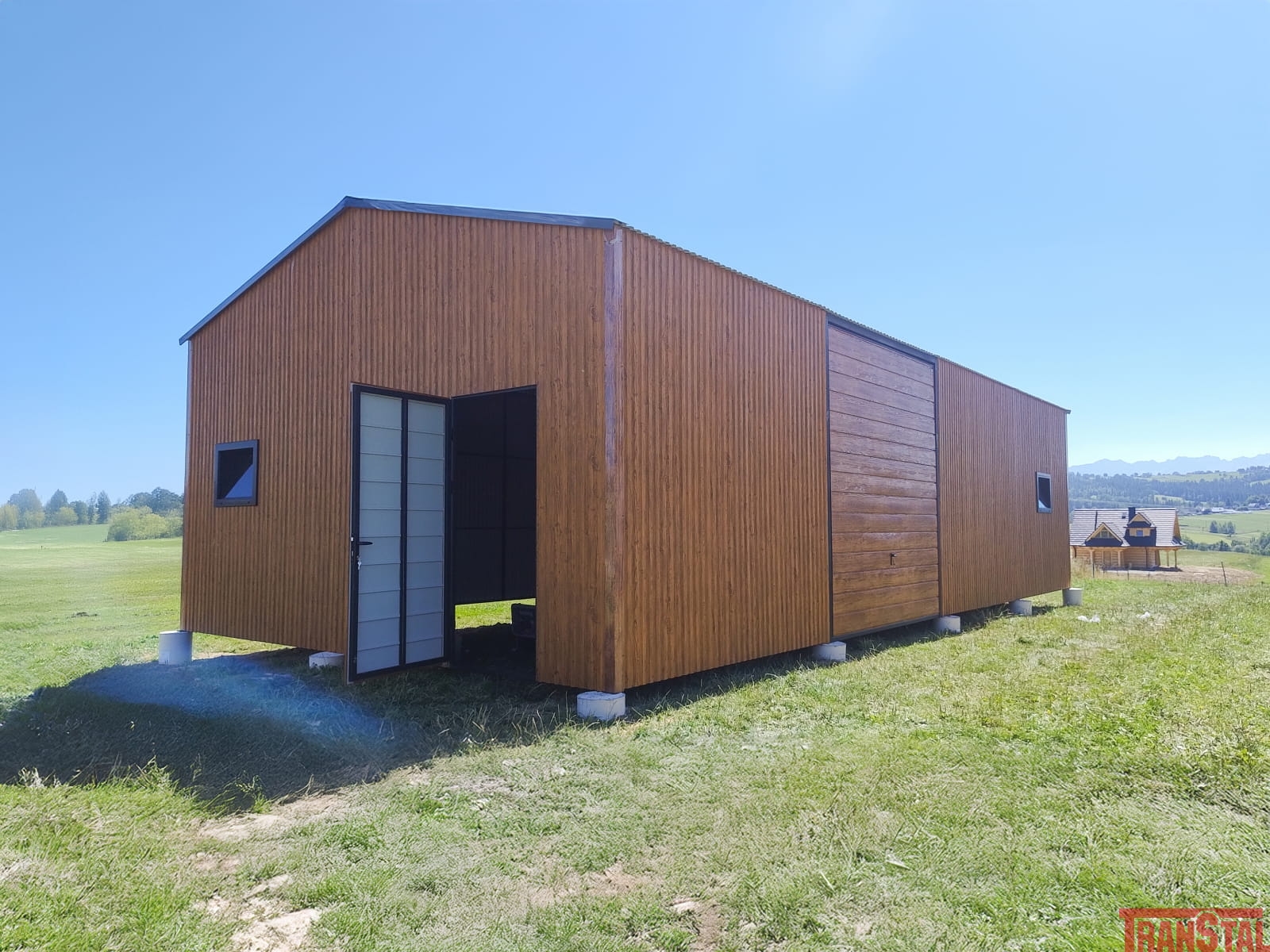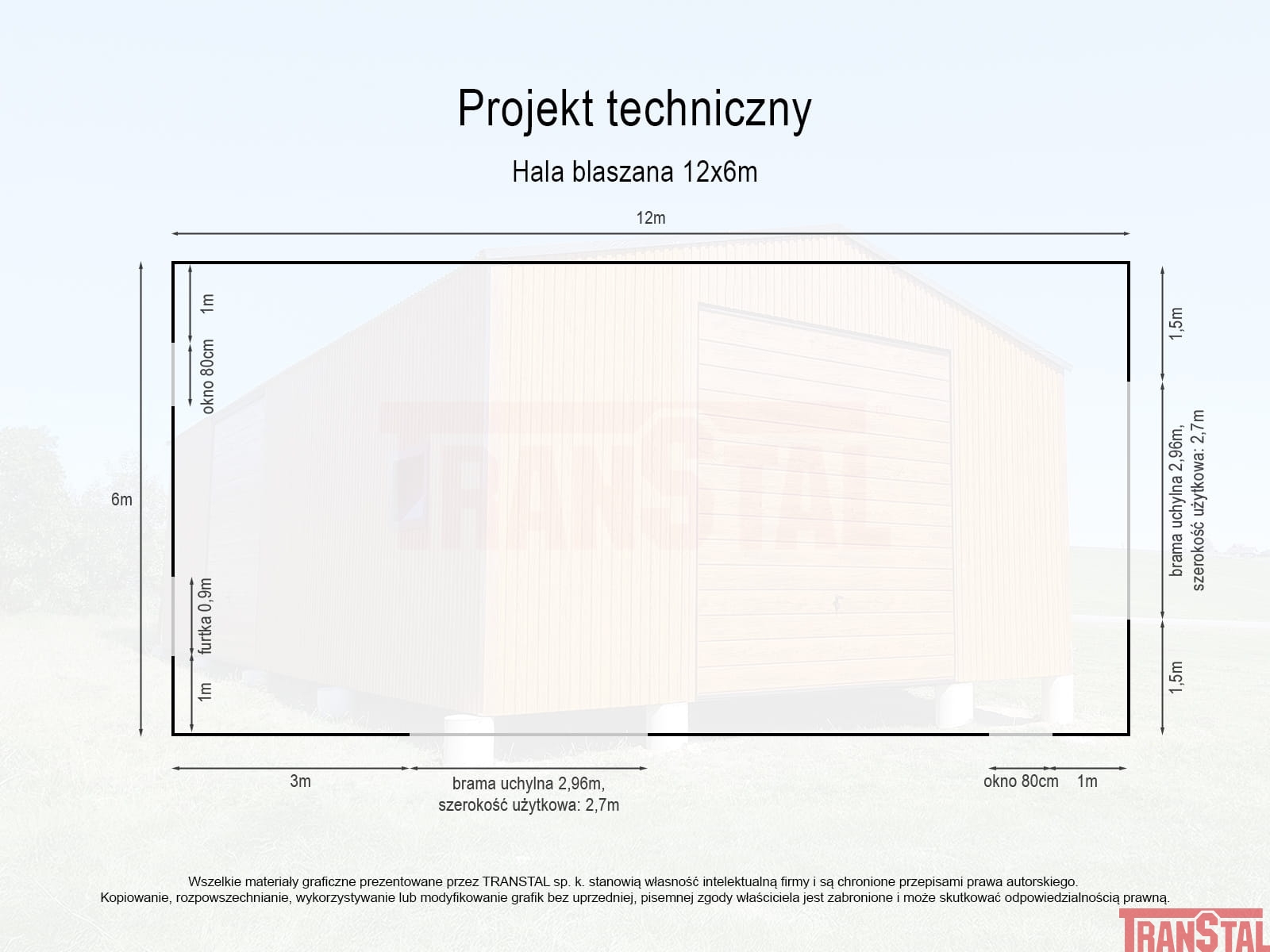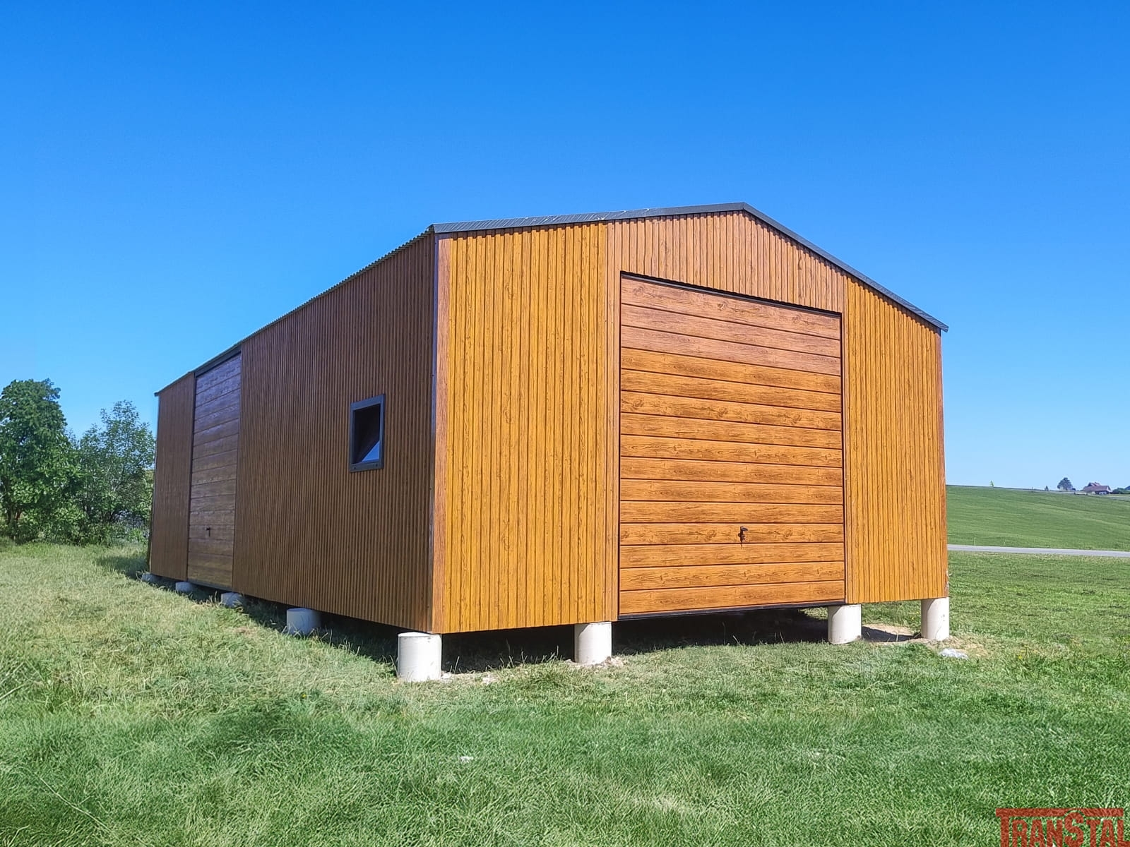 Hala blaszana / garaż o wymiarach 6x12m, dach dwuspadowy, dąb rustykalny