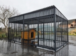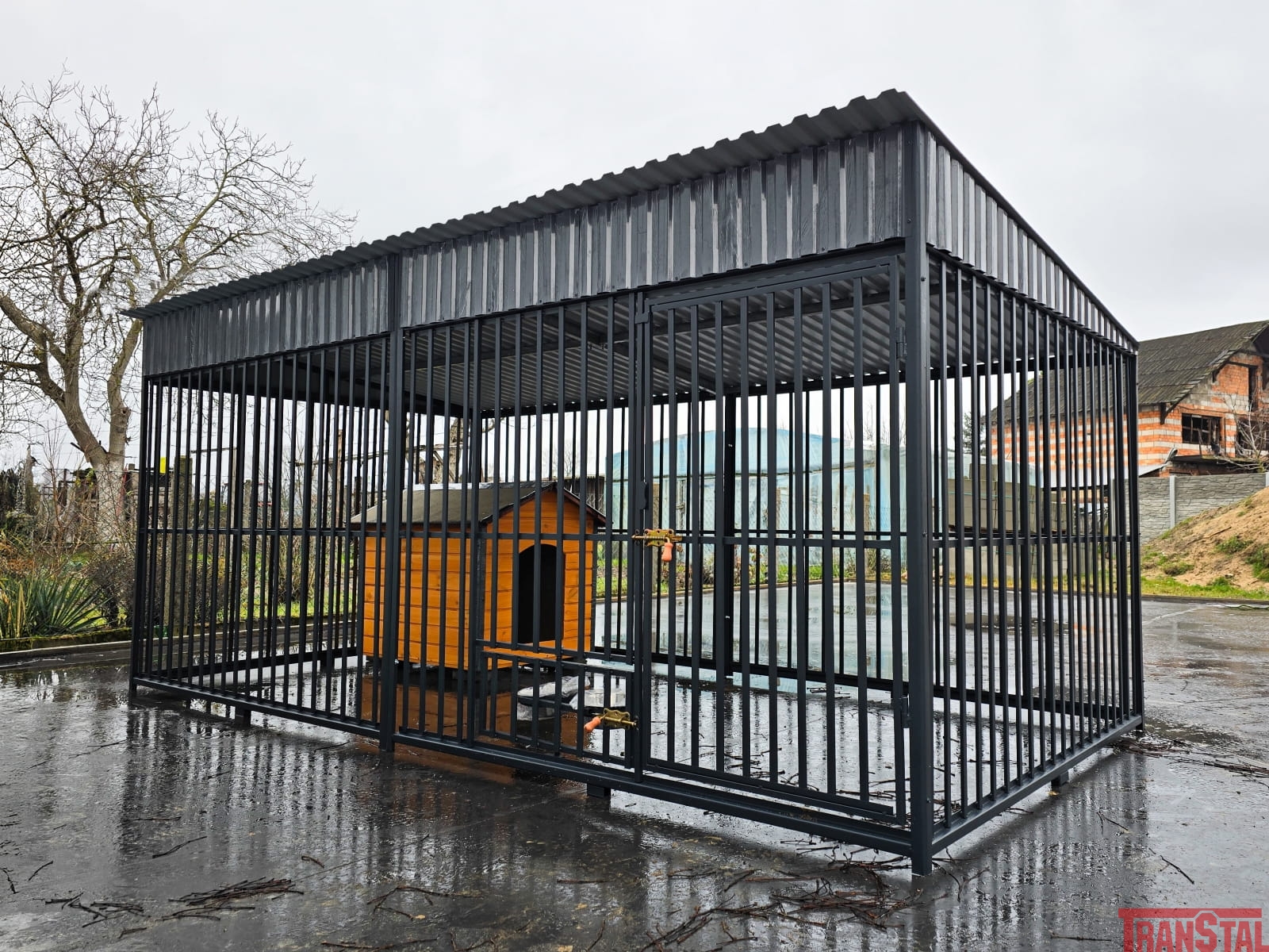 Solidny, zadaszony kojec dla dużych psów z budą XL oraz wiatrołapem.