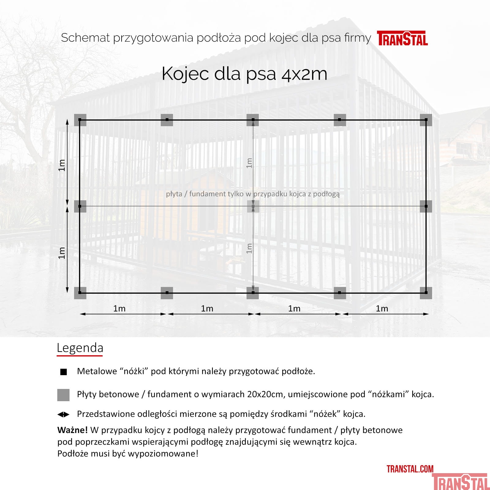 Konstrukcja z czarnej stali (nieocynkowanej) została pomalowana proszkowo, metoda piecową. Powierzchnia lakieru jest odporna na promieniowanie UV dzięki czemu kolor nie blaknie, pozostaje intensywny mimo upływu czasu. Kojec jest zadaszony dzięki czemu pies może przebywać w nim bez względu na warunki atmosferyczne.