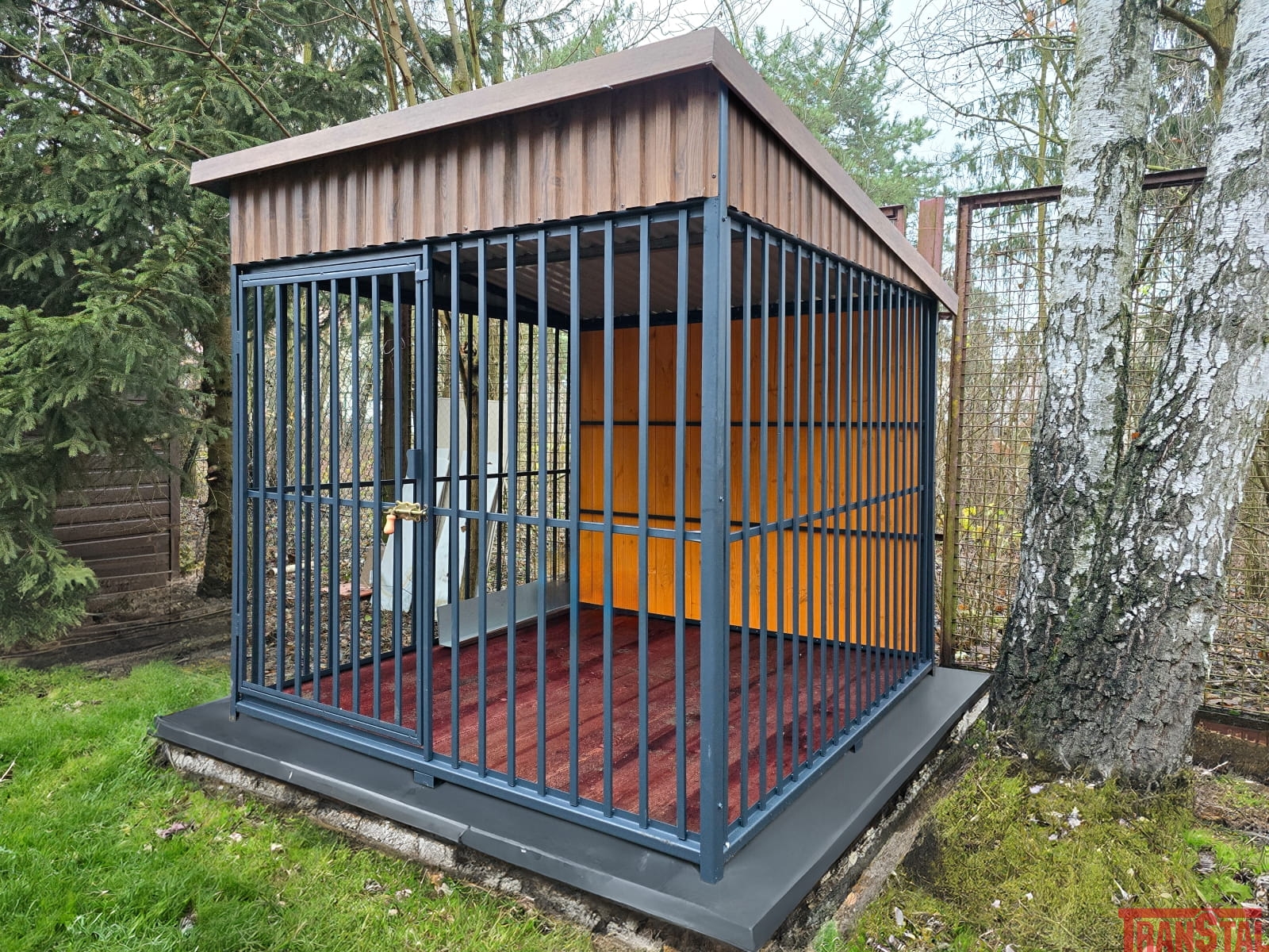 Konstrukcja z profili stalowych została pomalowana proszkowo, metoda piecową. Powierzchnia lakieru jest odporna na promieniowanie UV dzięki czemu kolor nie blaknie, pozostaje intensywny mimo upływu czasu. Kojec jest zadaszony dzięki czemu pies może przebywać w nim bez względu na warunki atmosferyczne. Dach kojca w podstawowym wariancie posiada spadek do tyłu.