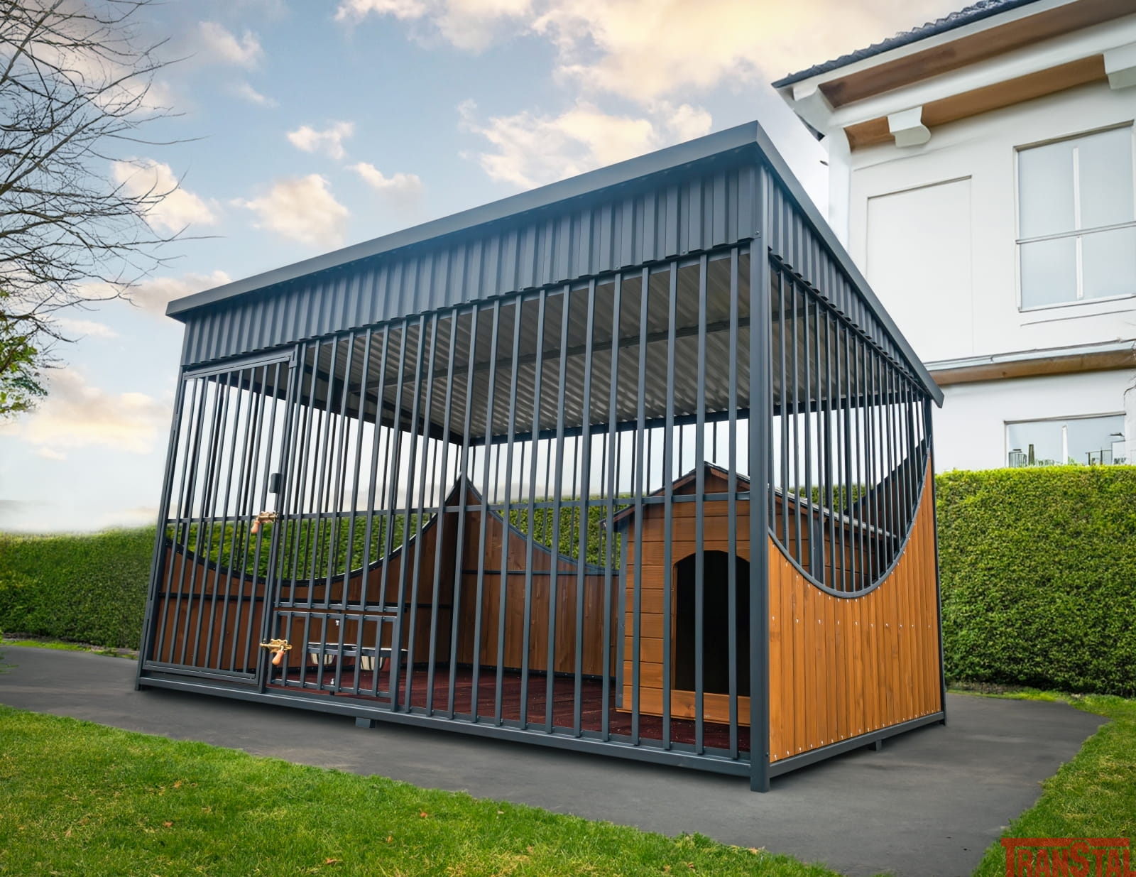 - Zadaszony kojec o wymiarach 2,9 x 2m wraz z oblachowanym wiatrołapem