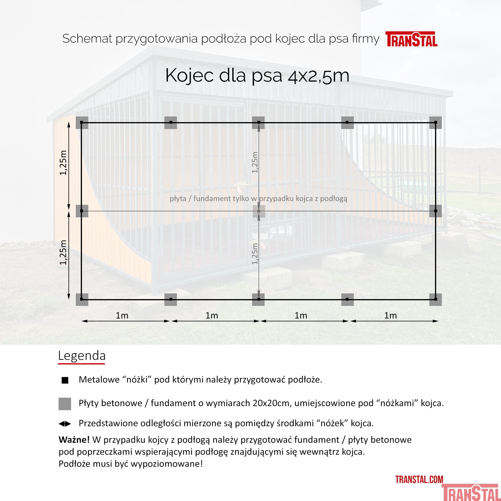 Konstrukcja została pomalowana proszkowo, metoda piecową. Powierzchnia lakieru jest odporna na promieniowanie UV dzięki czemu kolor nie blaknie, pozostaje intensywny mimo upływu czasu. Kojec jest zadaszony dzięki czemu pies może przebywać w nim bez względu na warunki atmosferyczne.