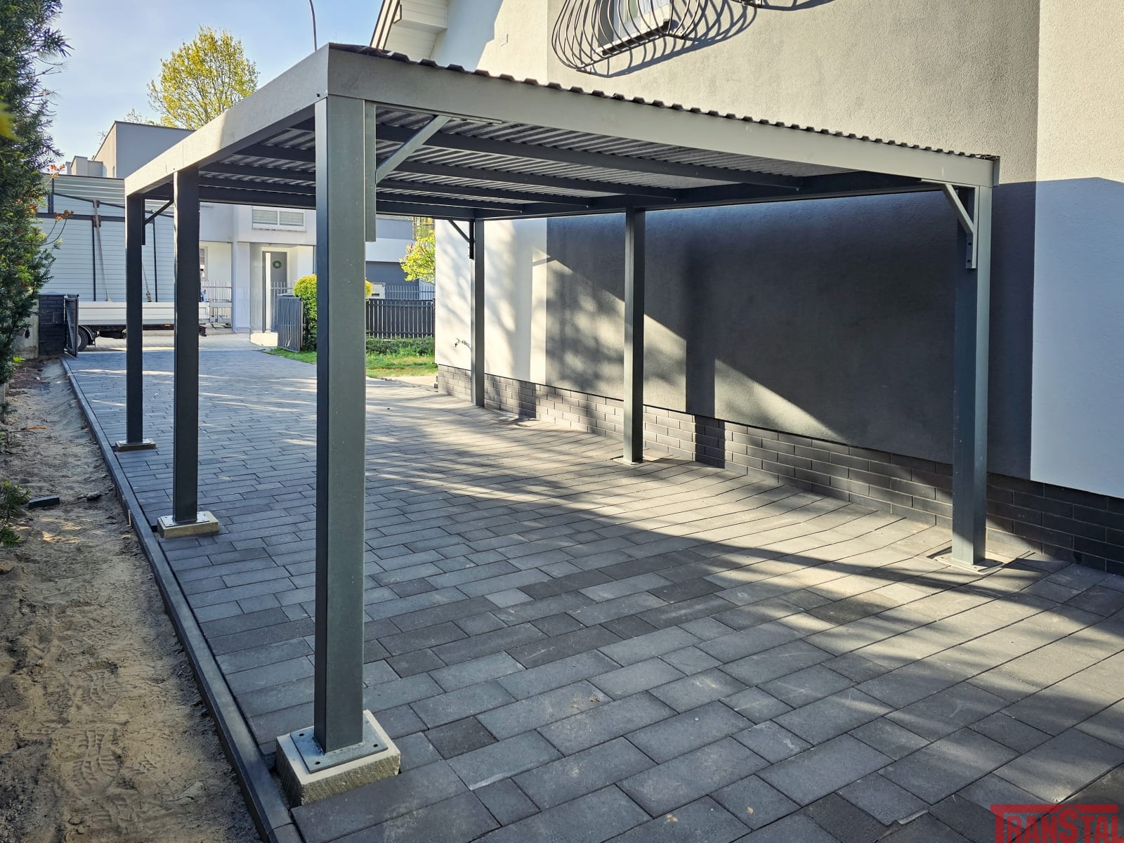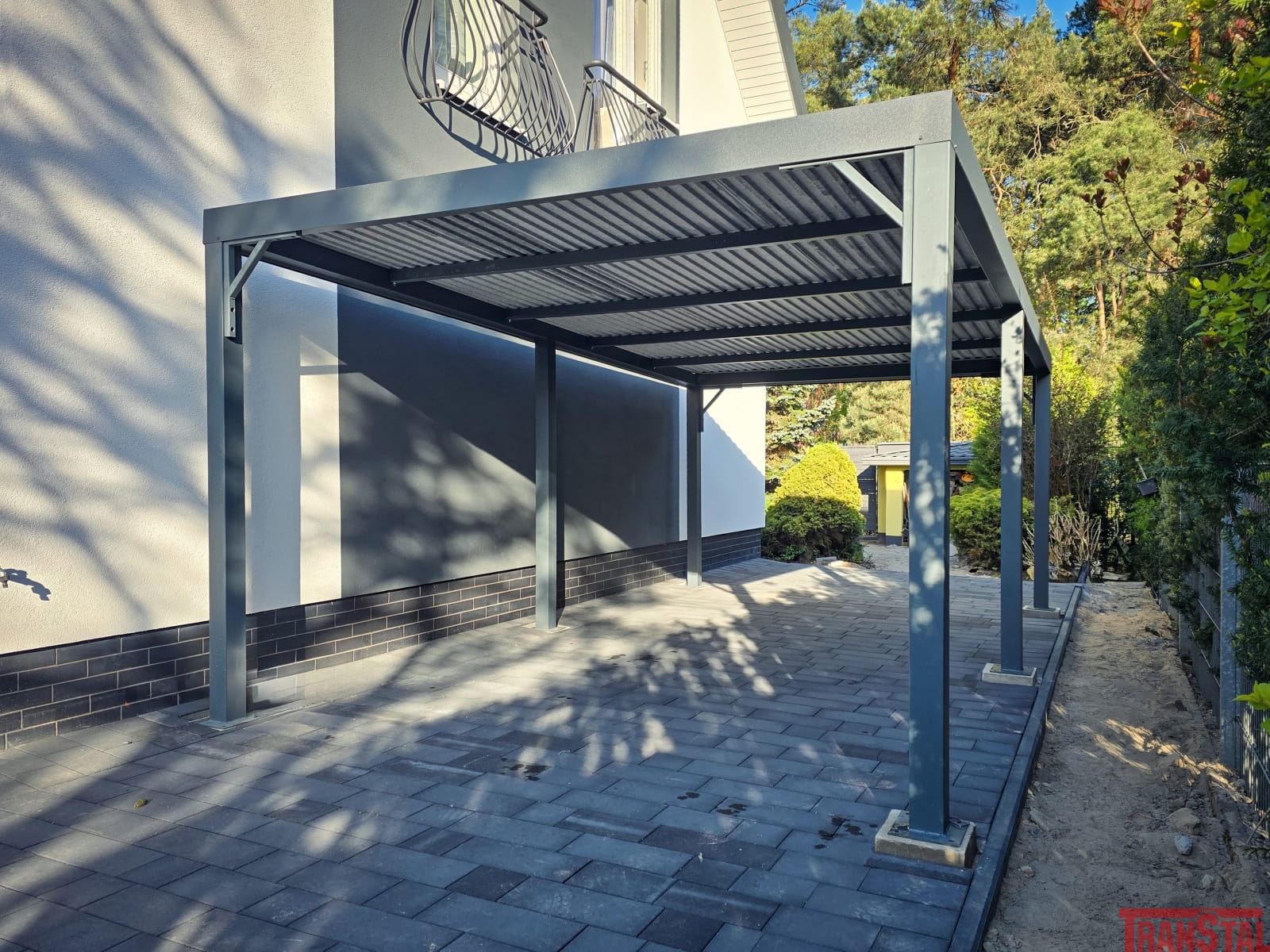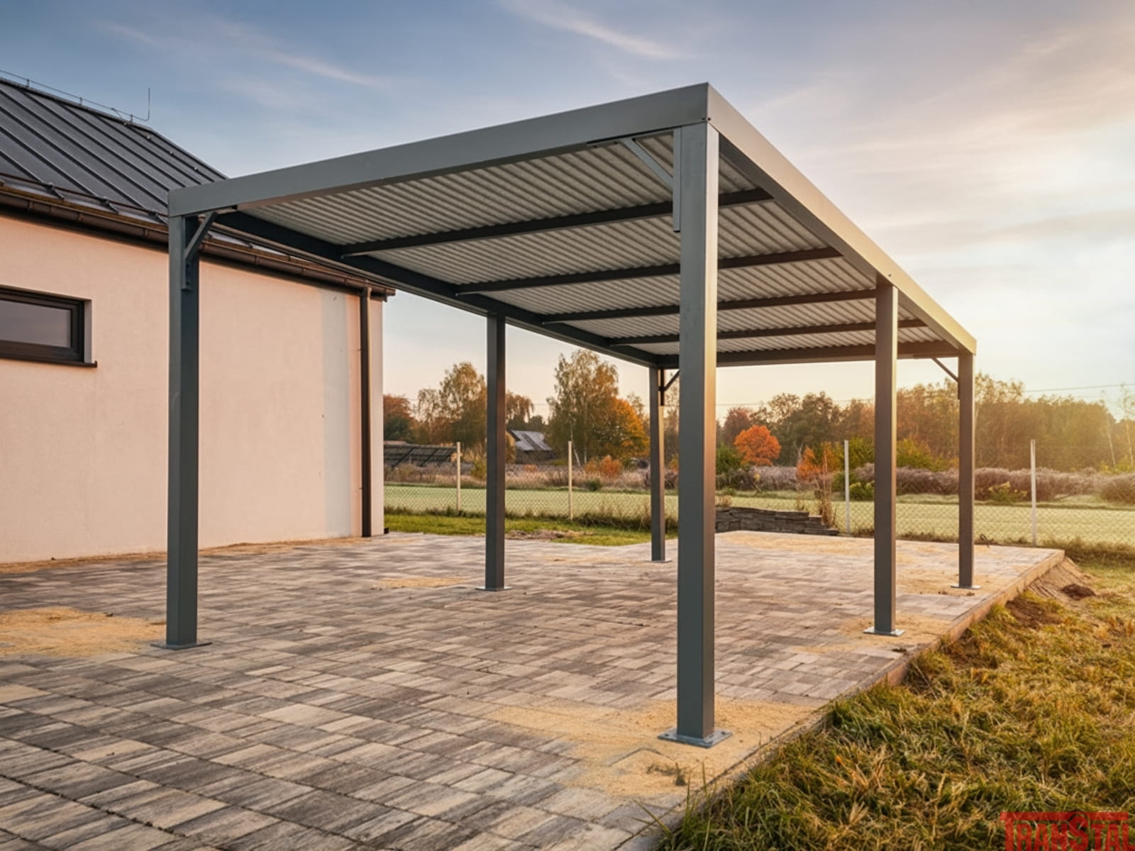Nowoczesna wiata garażowa typu Carport o wymiarach 3x6m i otwartej strukturze. Zaprojektowana na jednej pojazd z dodatkową przestrzenią pod zadaszeniem.