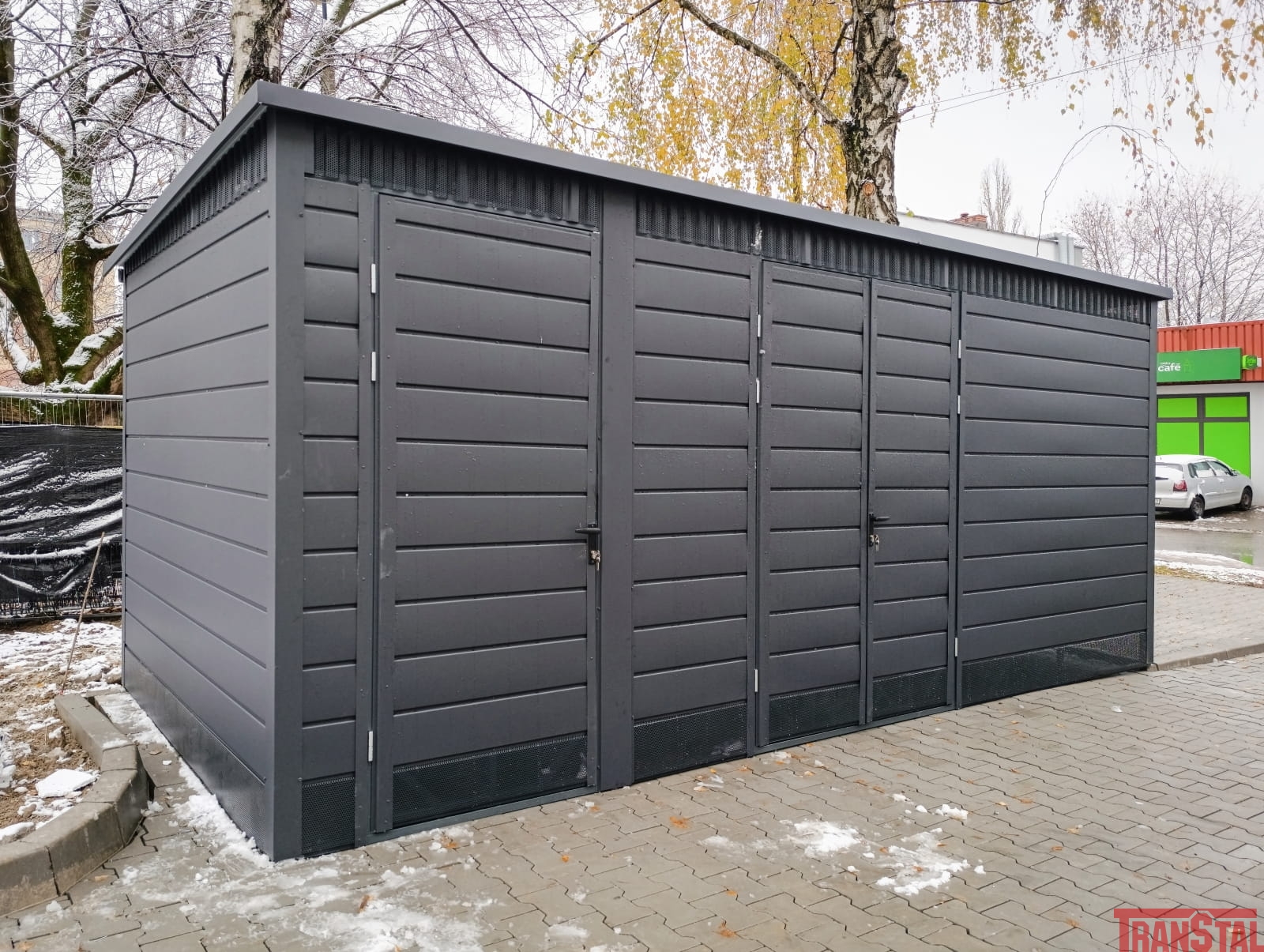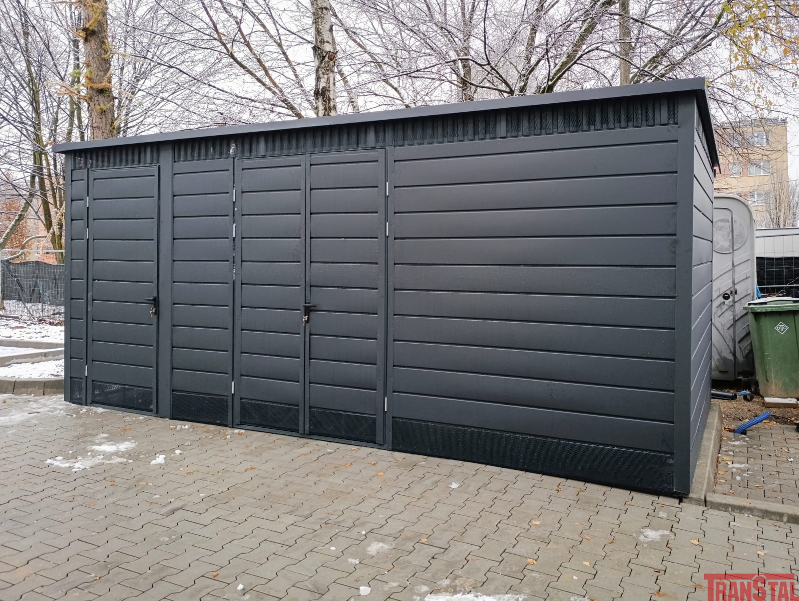 Wiata śmietnikowa 5,5x3, pełne oblachowanie, matowy grafit, ściana działowa